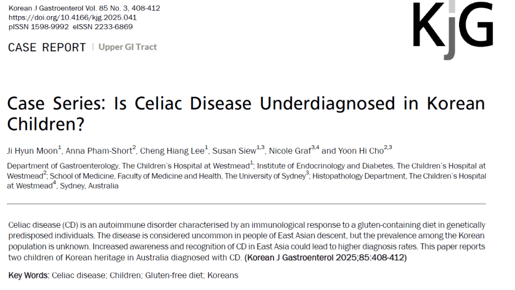 Coeliac disease is an autoimmune condition triggered by gluten in genetically susceptible individuals. Although traditionally considered rare in East Asian (Chinese, Japanese, and Korean) populations, emerging cases suggest it may be underdiagnosed. Dr. Lee’s paper, published in the Korean Journal of Gastroenterology, highlights two cases of coeliac disease in Australian-born children of Korean heritage, emphasising the importance of awareness and screening, even in populations where the condition remains uncommon. Children with clinical suspicion of coeliac disease should be screened to ensure timely diagnosis and care.